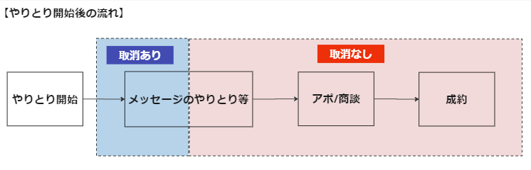 Q 1️⃣:やりとり開始直後やアポイント(商談)設定前にお断りされた 2️⃣:初回メッセージがないまま連絡が取れなくなった A:他社進行がある場合や商談が行われた後の場合は、取消はできかねます。