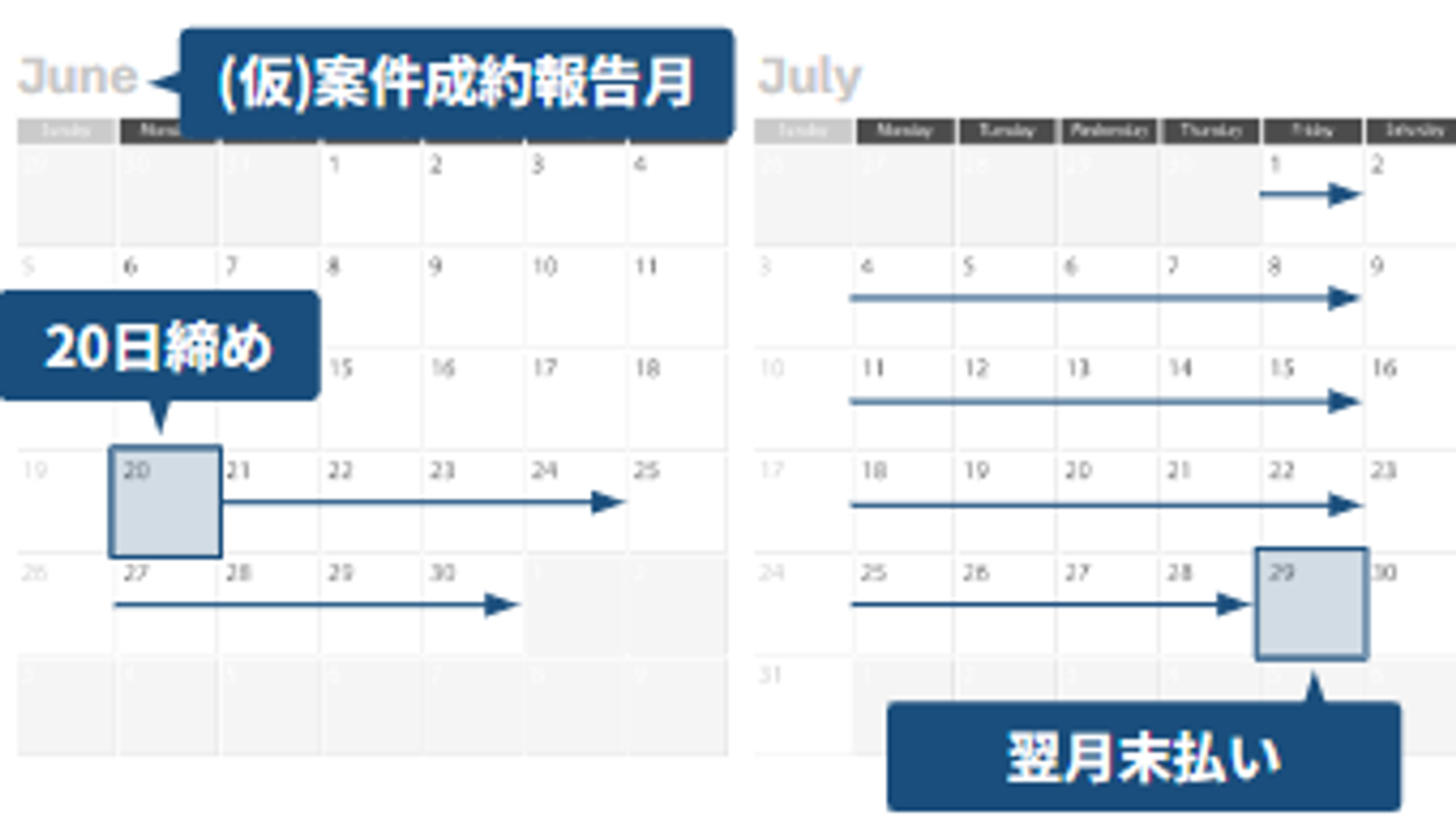 6月20日締め、7月初旬に請求書発行、7月末日までに支払い