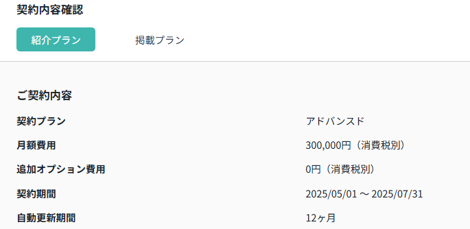 - 画面上部 紹介プラン/掲載プラン それぞれのタブからプラン内容を確認する。