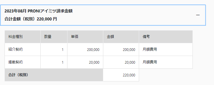 PRONIアイミツサービス利用(案件紹介を受ける、記事を掲載する)に対して発生する費用です。
