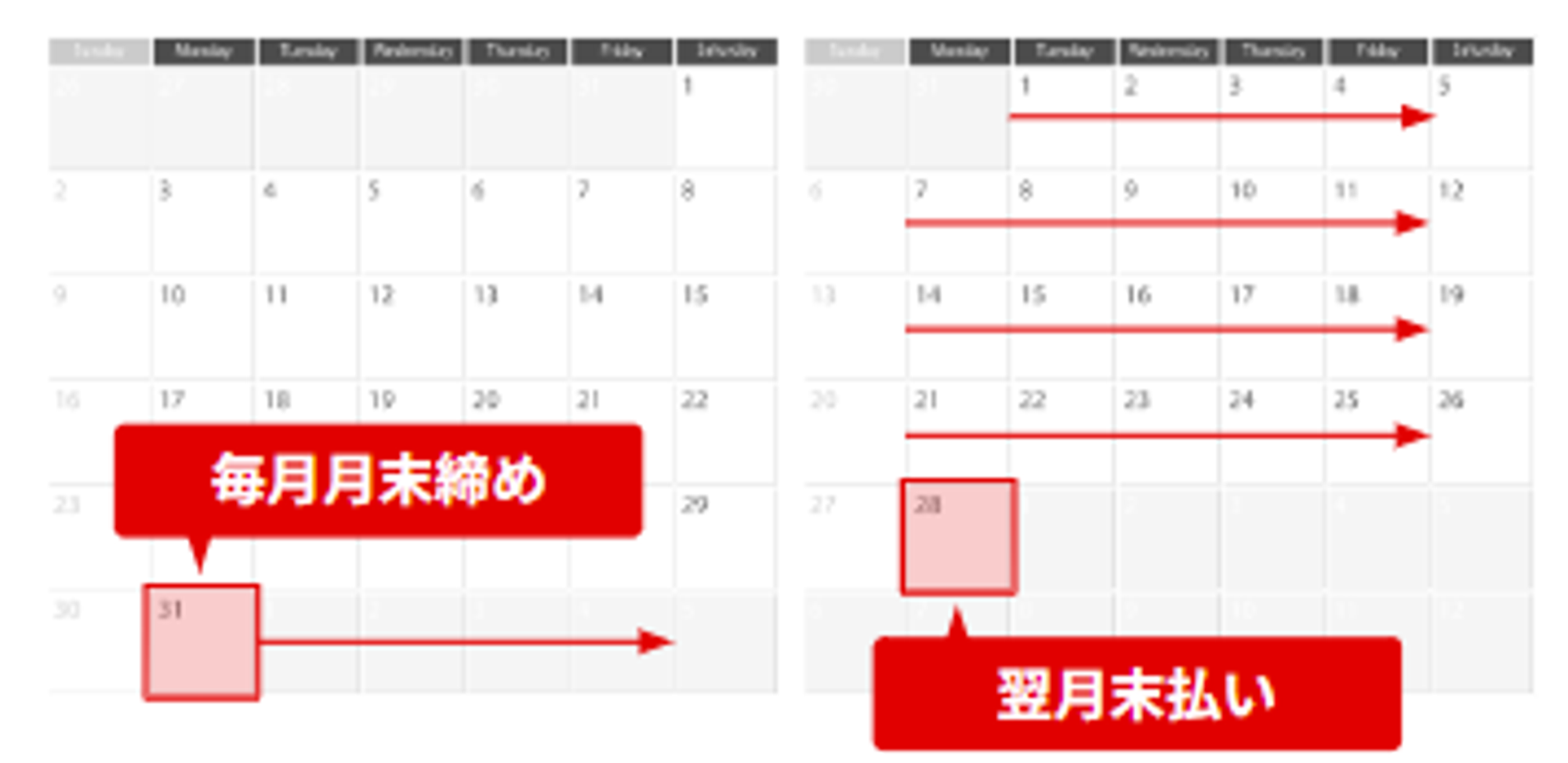 5月20日締め、6月初旬に請求書発行、6月末日までに支払い
