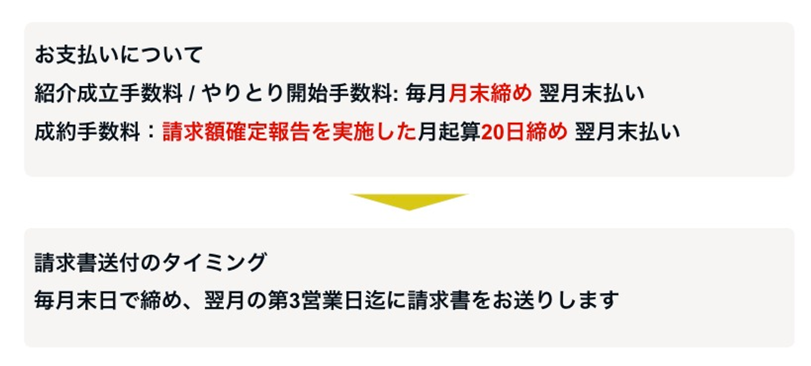 成約手数料以外のご利用料金は、基本の支払いサイトをご用意しておりますが各社ご契約内容に応じ異なります。