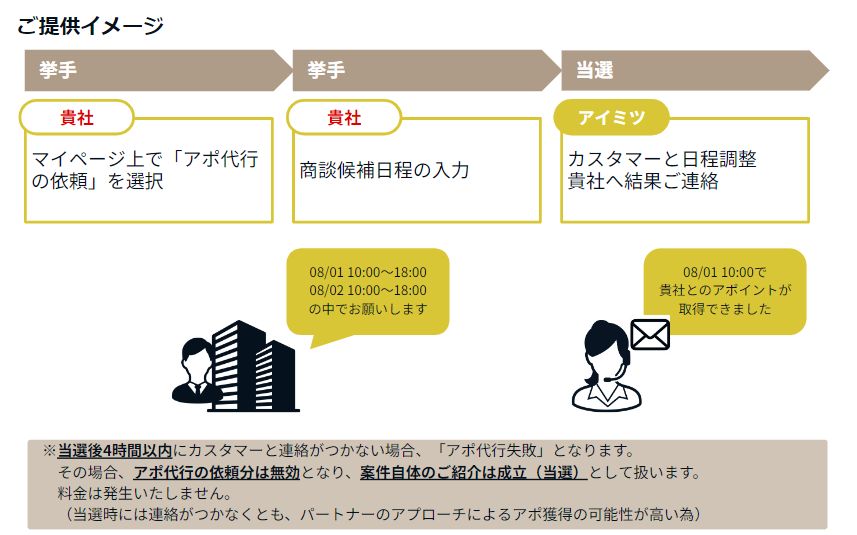 なお当選後4時間以内にカスタマーと連絡がつかない場合、アポ代行は失敗となります。