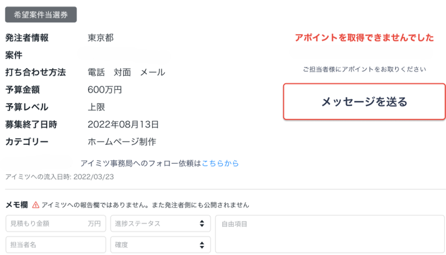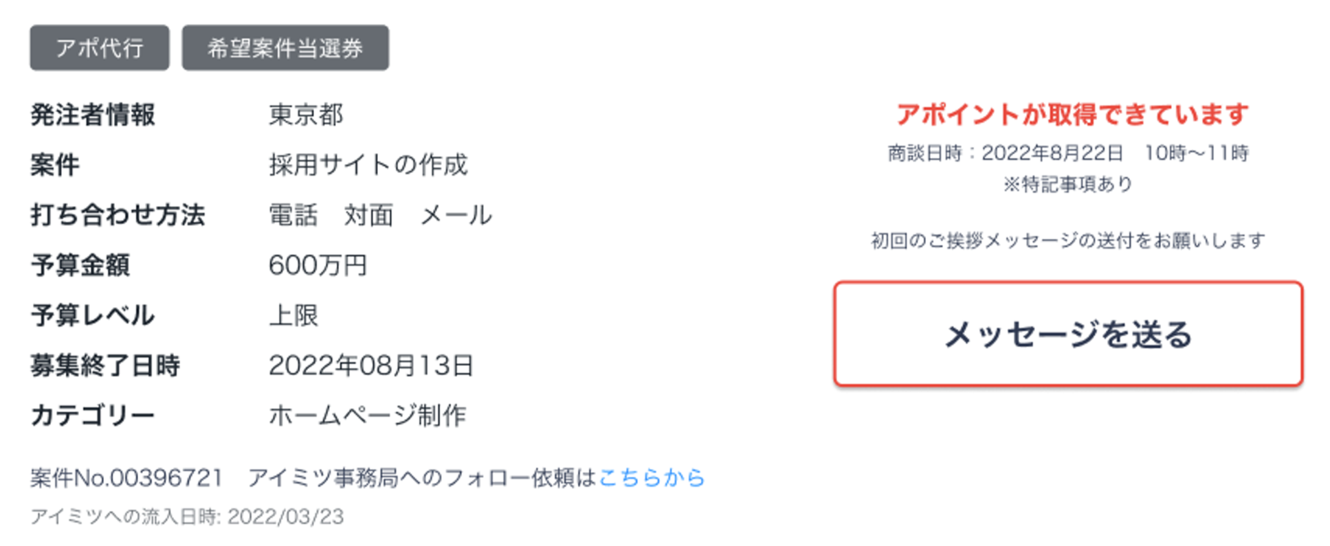 案件の挙手期限まで、アポ代行の依頼内容変更や依頼取消も可能でございます。