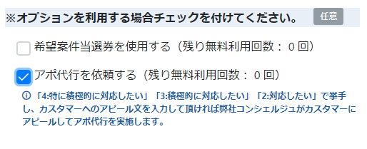 - アポ代行を依頼をいただいた案件の場合でも、落選することはございます。その場合、アポ代行利用回数は消化されません。 ※当選の確率を上げるためにはオプション「希望案件当選券」をご利用ください。