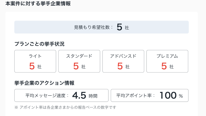 【 概要 】貴社に通知される全案件に対し、プランごとの他社挙手状況と、挙手企業全体の平均アポイント率を確認できます。