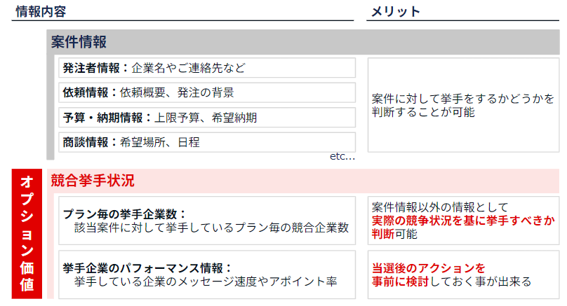 該当案件に対して「対応したい」と挙手をしている競合企業数を、プランごとに確認できます。