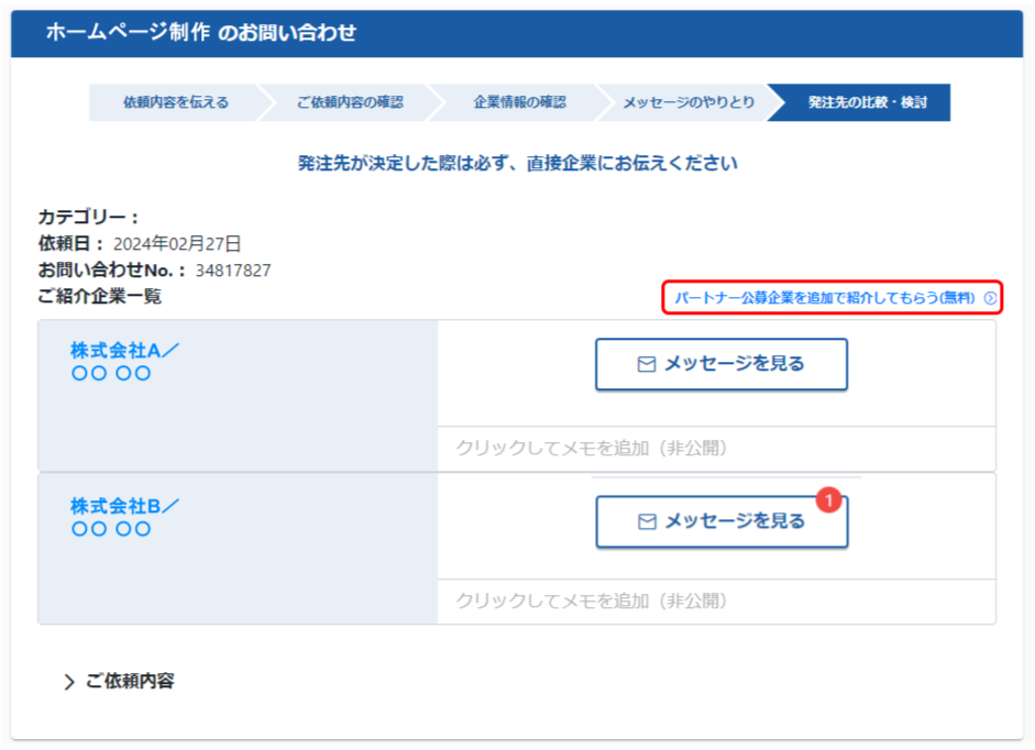「(カテゴリー名)企業を追加で紹介してもらう(無料)」をクリックし、
