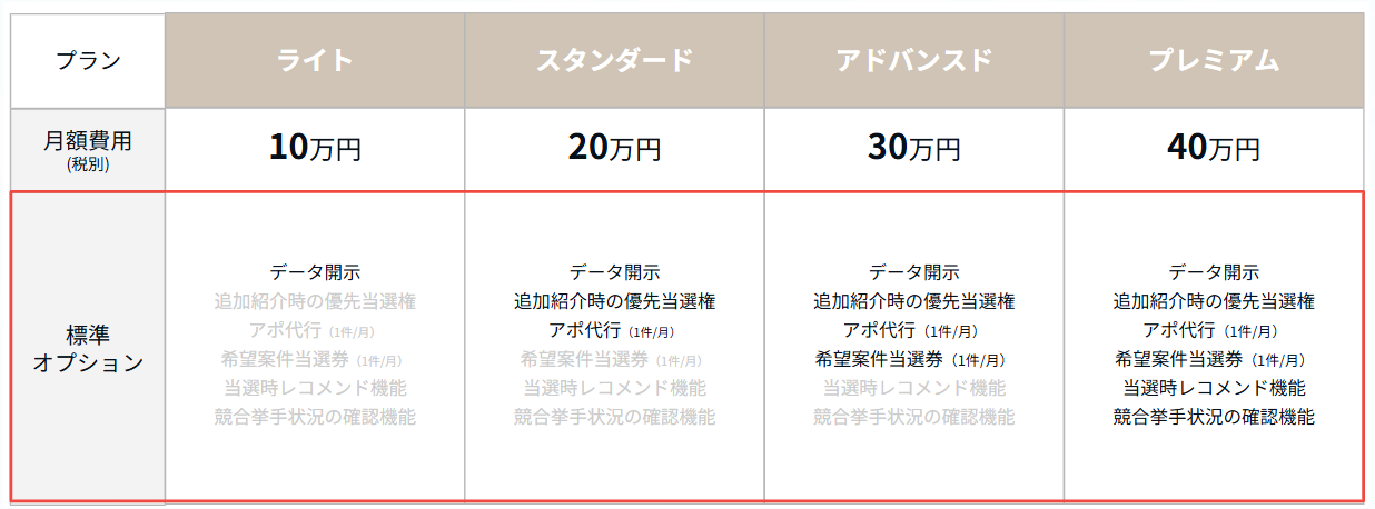 追加紹介時の優先当選権 | カスタマー要望により追加紹介を要請された際に優先して当選 | 月額5万円 | |