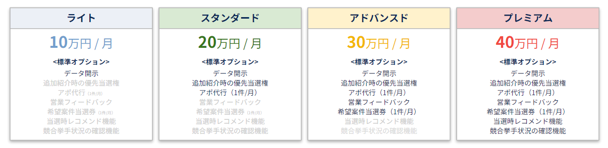 標準オプション:データ開示/追加紹介時の優先当選権/アポ代行(1件/月)/営業フィードバック/希望案件当選券(1件/月)/当選時レコメンド機能/競合挙手状況の確認機能