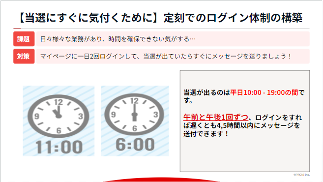 当選が出る時間帯は、PRONIアイミツの営業時間内(平日10:00-19:00)の為、午前と午後に1回ずつ、時間を決めてログインするように変えていきましょう。