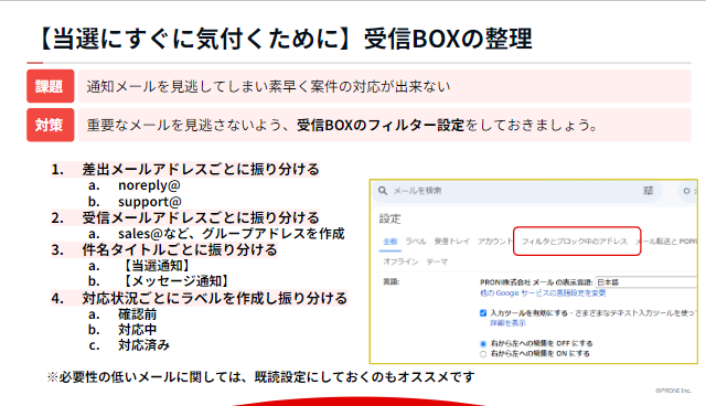 重要な通知メールを見逃さないよう、PRONIアイミツ用の受信ボックスのフィルター設定をしておくのをお勧めいたします。