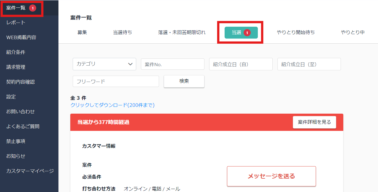 - 「当選」の横の数字は初回メッセージの未送信【案件数】です。