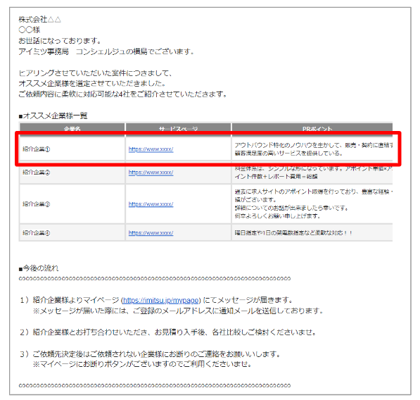 - カスタマー向けメールへ上位表示 当選と同時に、カスタマーに該当案件で紹介するパートナーの一覧を送付しております。 その一覧ページ表示において、一番上に表示させていただきます。