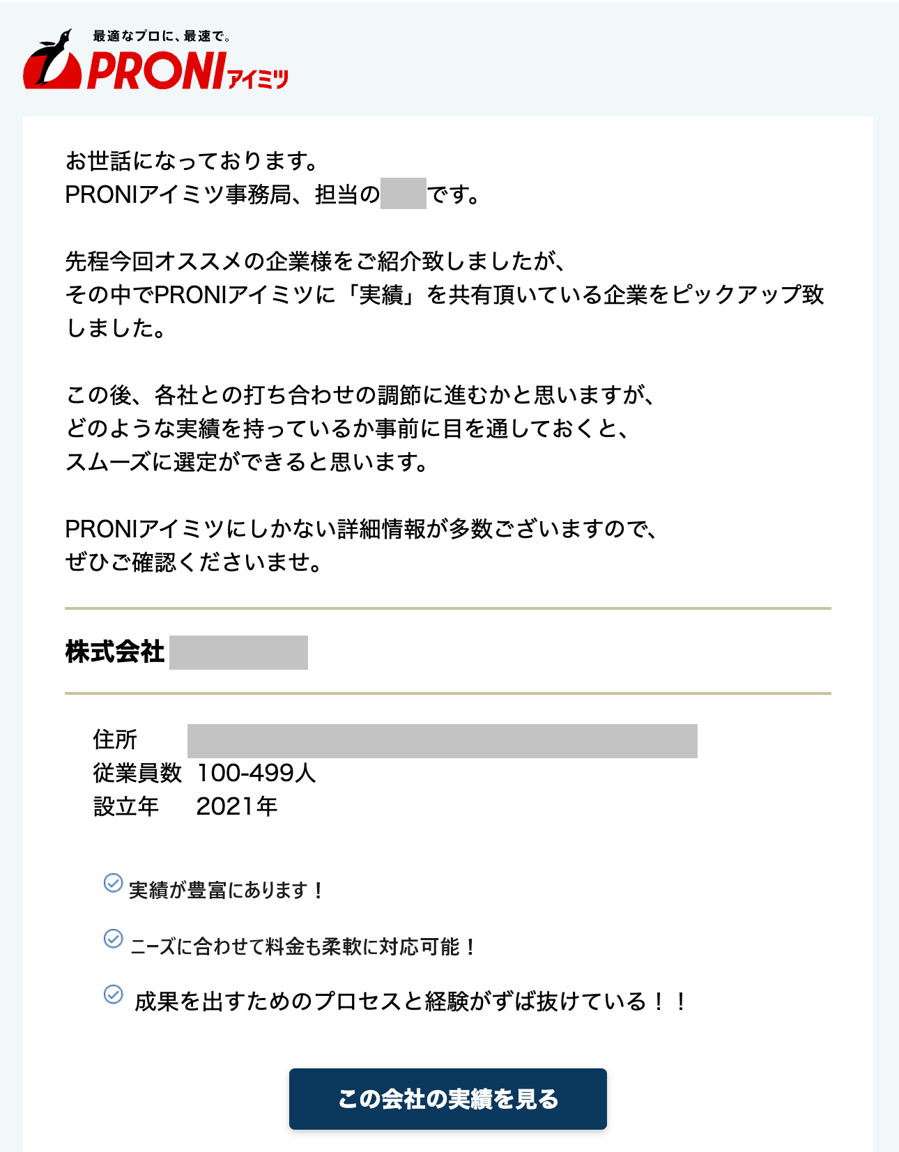 「実績PRメール」において、貴社の実績ページへのリンクを記載しているため、あらかじめWEB掲載内容に実績をご入力いただく必要がございます。