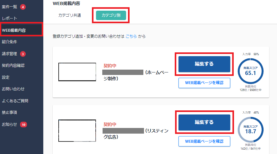 マイページ「WEB掲載内容」>「カテゴリ別」タブ内>「編集する」ボタンから編集できます。