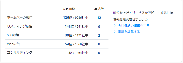 ・掲載順位 :WEB掲載内容の入力率によって弊社サイトでの表示順位が変動します。